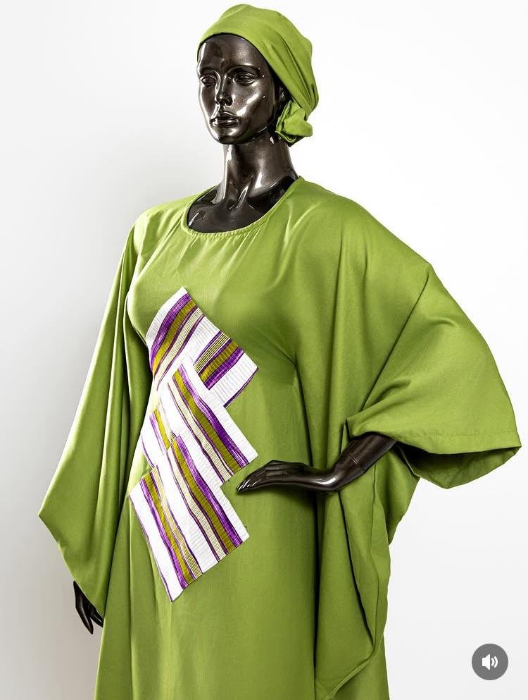Boubou long fluide vert olive, revisité avec des motifs géométriques africains.